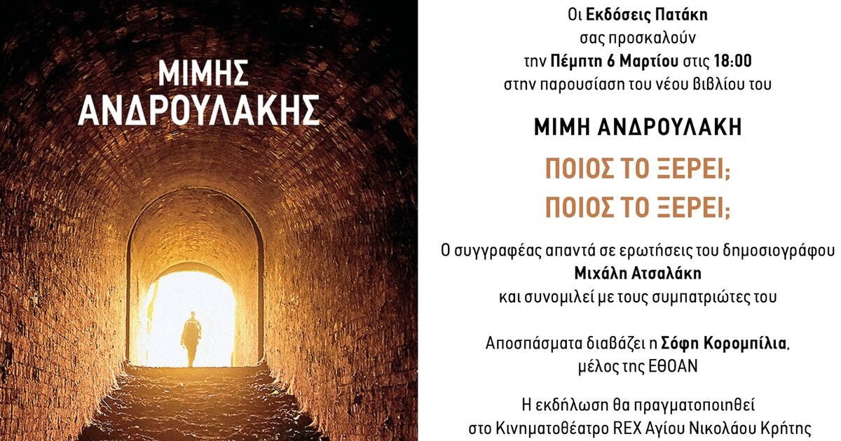 Το νέο βιβλίο του Μίµη Ανδρουλάκη µε τίτλο “Ποιος το ξέρει; Ποιος το ξέρει;” που κυκλοφορεί από τις εκδόσεις Πατάκη θα παρουσιαστεί την Πέμπτη 6 Μαρτίου 2025 στις 18:00 στο κινηματοθέατρο REX στον Άγιο Νικόλαο.