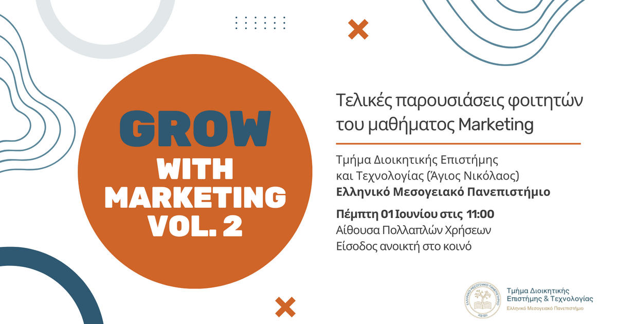 Οι φοιτητές στο Τμήμα Διοικητικής Επιστήμης και Τεχνολογίας του ΕΛΜΕΠΑ παρουσιάζουν σε ειδική εκδήλωση, τις τελικές προτάσεις marketing που σχεδίασαν στο πλαίσιο του μαθήματος Μάρκετινγκ (Β’ εξάμηνο σπουδών).