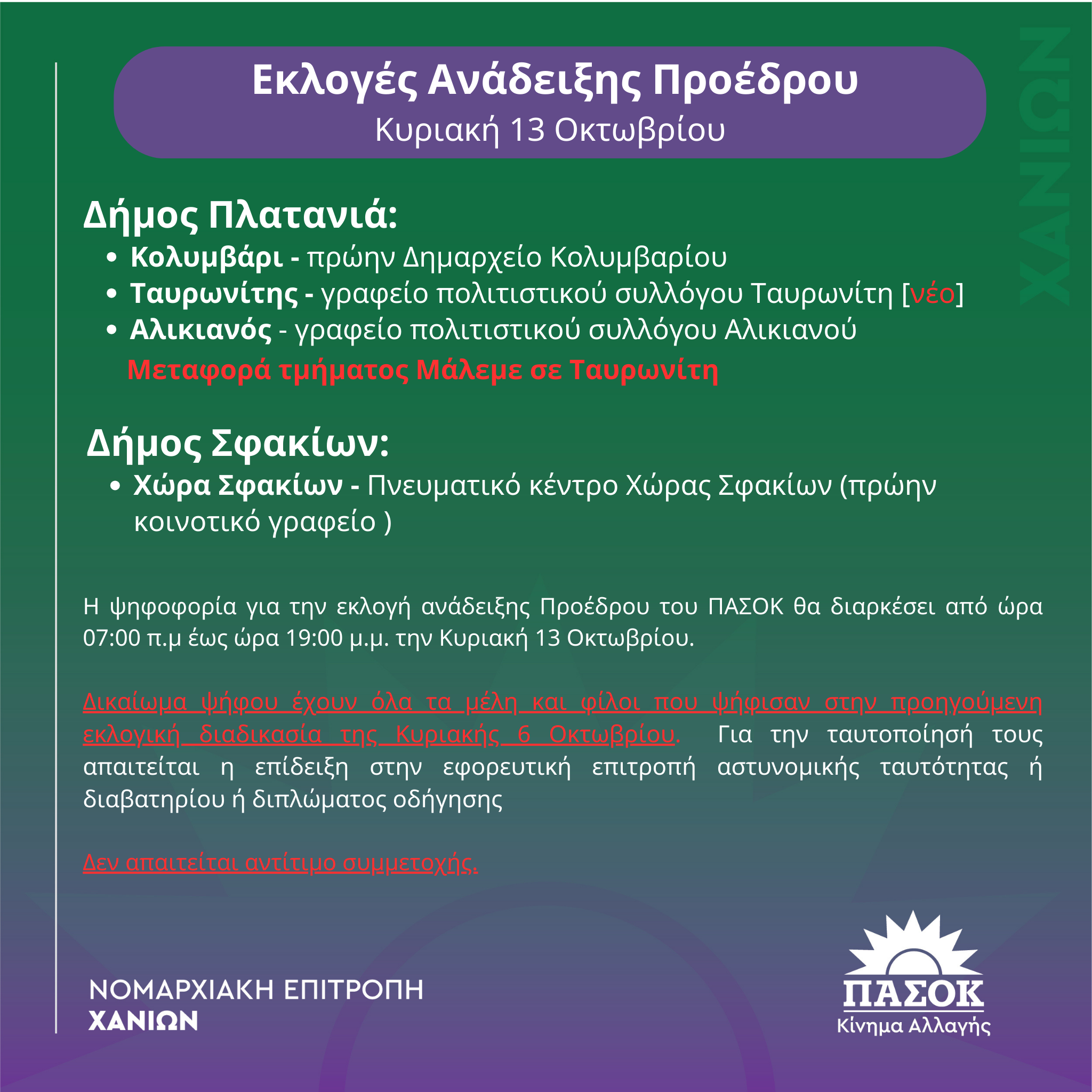 Αναφορικά με τον 2ο γύρο εκλογών για την ανάδειξη νέου προέδρου στο ΠΑΣΟΚ, ενημερώνουμε τα μέλη και τους φίλους του κινήματος ότι η εκλογική διαδικασία θα διαρκέσει από τις 07:00 π.μ. έως τις 19:00 μ.μ., την Κυριακή 13 Οκτωβρίου. Δικαίωμα ψήφου έχουν όλα τα μέλη και φίλοι που συμμετείχαν με την ψήφο τους στις εκλογές του 1ου γύρου την προηγούμενη Κυριακή. Δεν απαιτείται η καταβολή τιμήματος για την συμμετοχή στην εκλογική διαδικασία. Επίσης οι ψηφοφόροι μπορούν να ψηφίσουν σε οποιαδήποτε τμήμα ανεξαρτήτως με το που ψήφισαν κατά τον 1ο γύρο. Τέλος ενημερώνουμε για την μεταφορά του εκλογικού τμήματος Μάλεμε στον Ταυρωνίτη και συγκεκριμένα στο χώρο του πολιτιστικού συλλόγου Ταυρωνίτη. Όλα τα υπόλοιπα εκλογικά τμήματα θα παραμείνουν τα ίδια.