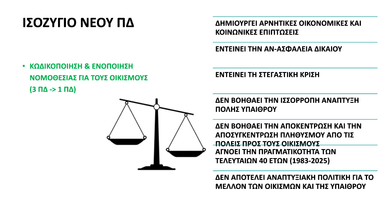 Ο Γιώργος Αλεξάκης παρουσίασε ενδεικτικά κάποιες μειώσεις στην πολεοδόμηση οικισμών που θα επιφέρει το Προεδρικό Διάταγμα εφόσον ισχύσει ως έχει: