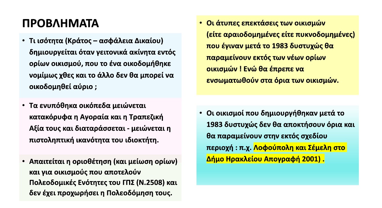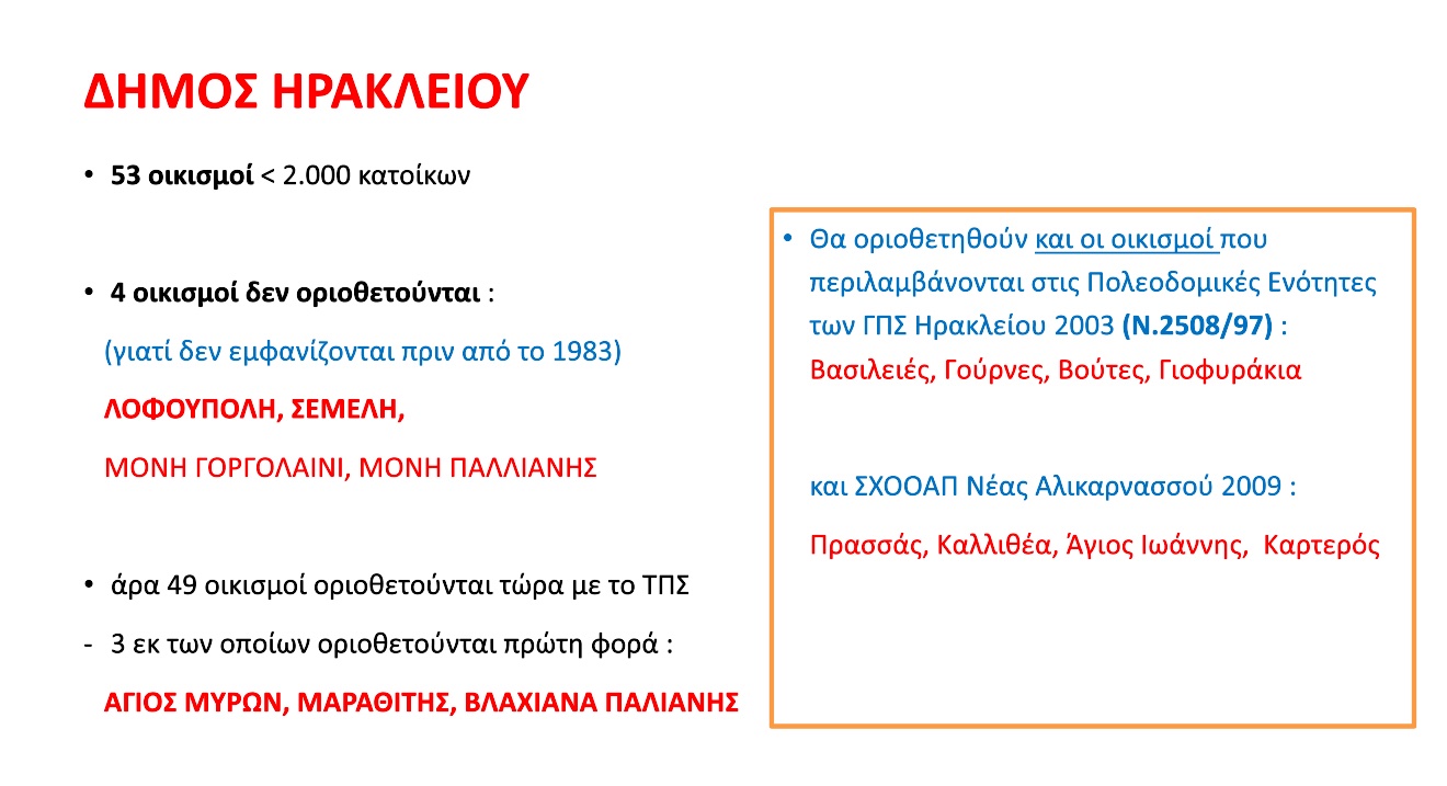 Ο ίδιος σημείωσε ότι θα οριοθετηθούν και οι οικισμοί που περιλαμβάνονται στις Πολεοδομικές Ενότητες των ΓΠΣ Ηρακλείου 2003: Βασιλείες, Γούρνες, Βούτες,Γιοφυράκια και στο ΣΧΟΟΑΠ Ν.Αλικαρνασσού του 2009: Πρασάς, Καλλιθέα, Άγιος Ιωάννης Καρτερός.