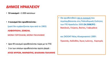 Όπως ο κ.Αλεξάκης γνωστοποίησε ότι από τους 53 οικισμούς με πληθυσμό κάτω των 2.000 κατοίκων στον δήμο Ηρακλείου, οριοθετούνται 49 καθώς δεν εμφανίζονται πριν το 1983, 4 (Λοφούπολη, Σεμέλη, Μονή Γοργολαΐνι, Μονή Παλιανής). Από τους 49 οικισμούς, εξήγησε ο κ.Αλεξάκης, 3 οριοθετούνται για πρώτη φορά: Άγιος Μύρων, Μαραθίτης, Βλαχιανά Παλιανής.