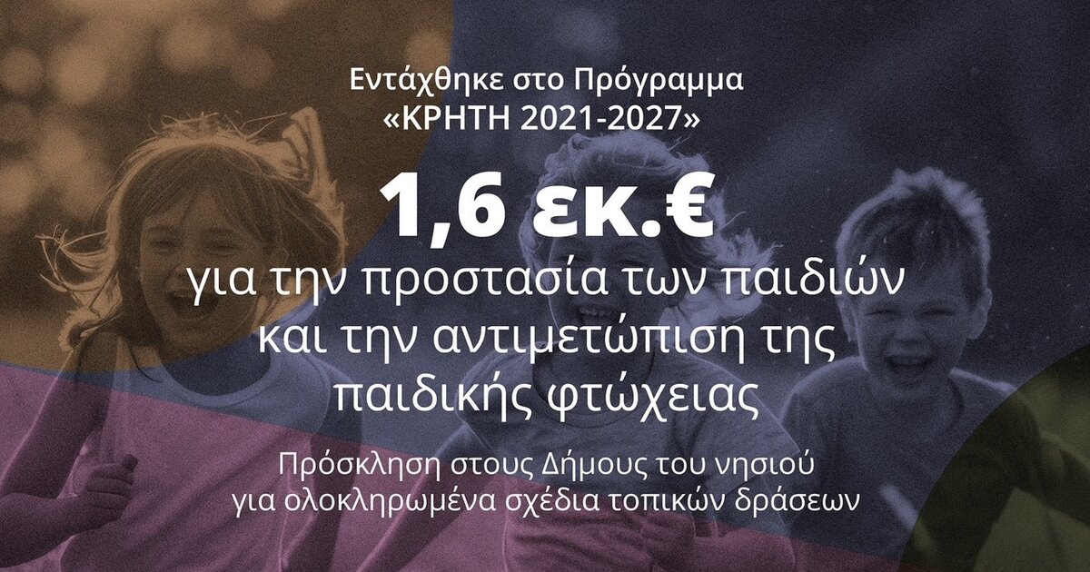 Την πρόσκληση για την υποβολή προτάσεων στη δράση «Ολοκληρωμένα Σχέδια Τοπικών Δράσεων για την προστασία των παιδιών και για την αντιμετώπιση της παιδικής φτώχειας στην Περιφέρεια Κρήτης» υπέγραψε ο Περιφερειάρχης Κρήτης Σταύρος Αρναουτάκης. Η δράση, συνολικού προϋπολογισμού 1.600.000 ευρώ, εντάσσεται στο Πρόγραμμα «ΚΡΗΤΗ» 2021-2027 και συγχρηματοδοτείται από το Ευρωπαϊκό Κοινωνικό Ταμείο+ (ΕΚΤ+).