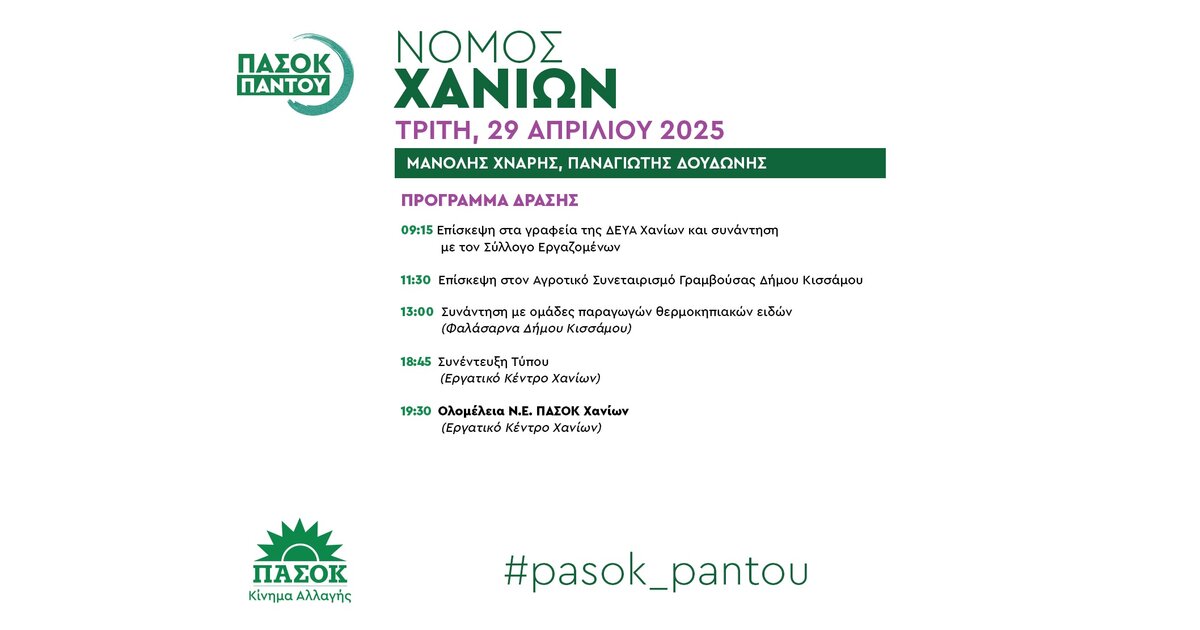 Στο πλαίσιο της πανελλαδικής δράσης «ΠΑΣΟΚ ΠΑΝΤΟΥ», ο Τομεάρχης Αγροτικής Ανάπτυξης του ΠΑΣΟΚ - Κινήματος Αλλαγής - Βουλευτής Ρεθύμνης Μανώλης Χνάρης και ο Γραμματέας Κοινοβουλευτικής Ομάδας του ΠΑΣΟΚ - Βουλευτής Επικρατείας Παναγιώτης Δουδωνής και η Νομαρχιακή Επιτροπή Χανίων θα πραγματοποιήσουν περιοδεία στον Νομό Χανίων την Τρίτη 29 Απριλίου 2025.