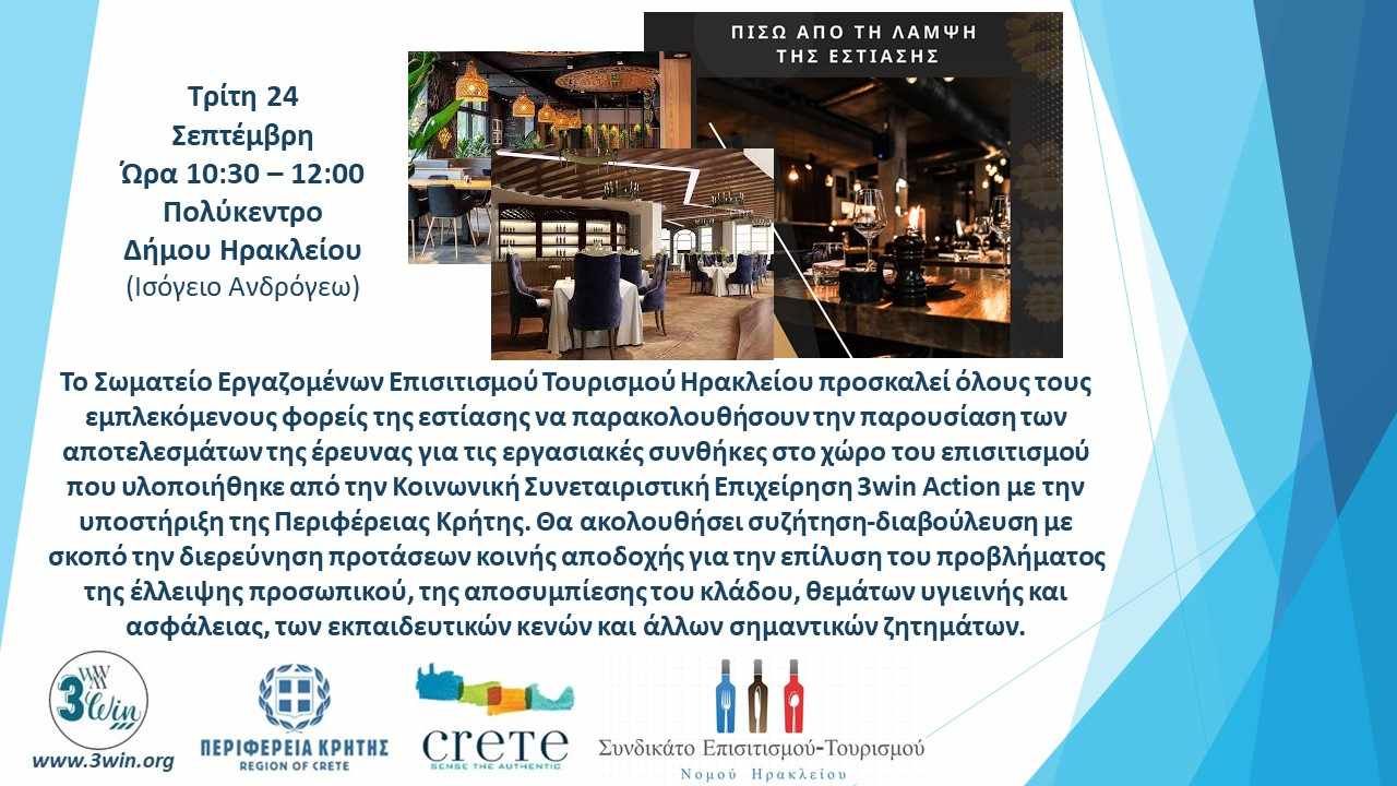To Σωματείο Εργαζόμενων Επισιτισμού Τουρισμού Ηρακλείου προσκαλεί όλους του εμπλεκόμενους φορείς της εστίασης να παρακολουθήσουν την παρουσίαση των αποτελεσμάτων της έρευνας για τις εργασιακές συνθήκες στον χώρο του επισιτισμού που υλοποιήθηκε από την Κοινωνική Συνεταιριστική Επιχείρηση 3win Action με την υποστήριξη της Περιφέρειας Κρήτης.