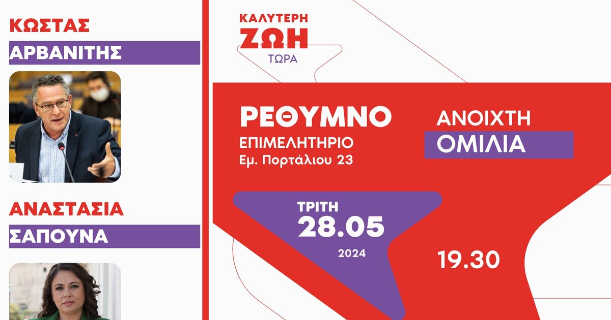 Ανοιχτή πολιτική εκδήλωση θα πραγματοποιήσει η Νομαρχιακή Επιτροπή Ρεθύμνου του ΣΥΡΙΖΑ, αύριο Τρίτη 28 Μαϊου, στις 7.30 το απόγευμα με ομιλητές τους υποψήφιους ευρωβουλευτές, Κώστα Αρβανίτη και Αναστασία Σαπουνά