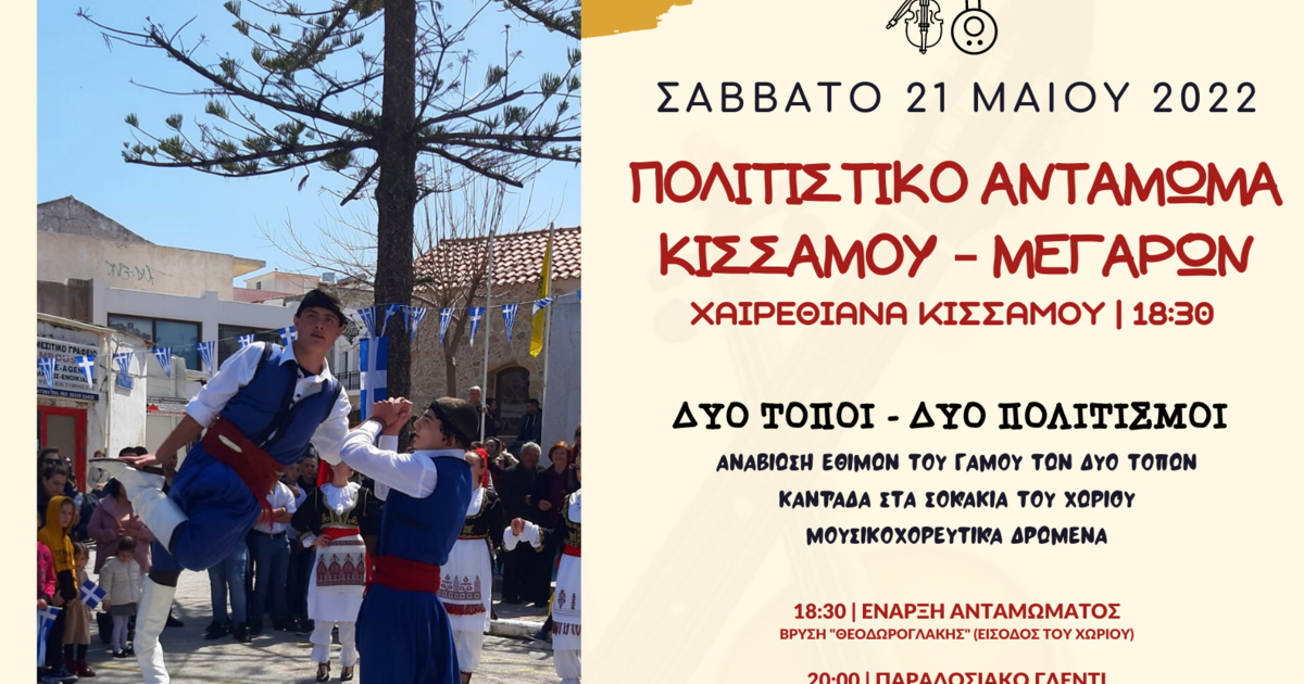 Η Κίσσαμος και τα Μέγαρα θα ανταμώσουν τα ήθη, τα έθιμα και την μουσικοχορευτική τους παράδοση. Τα Χαιρεθιανα θα αγκαλιάσουν αυτή τη διοργάνωση και ολόκληρο το χωριό, θα μετατραπεί σε μια εστία του λαϊκού μας πολιτισμού, αναδεικνύοντας τα πολιτιστικά στοιχεία των δύο τόπων.