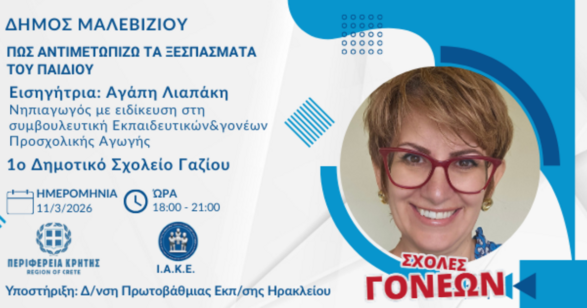 Η Περιφέρεια Κρήτης, το Ινστιτούτο Ανθρωπιστικών και Κοινωνικών Επιστημών (ΙΑΚΕ) σε συνεργασία με τον Δήμο Μαλεβιζίου και τη Διεύθυνση Πρωτοβάθμιας εκπαίδευσης Ηρακλείου, πραγματοποιούν συνάντηση στο πλαίσιο του 2ου κύκλου της Σχολής Γονέων, την Τετάρτη 11 Μαρτίου 2026 και ώρα 18:00-21:00 στο 1ο Δημοτικό Σχολείο Γαζίου. Η συνάντηση θα έχει ως θέμα «Πως αντιμετωπίζω τα ξεσπάσματα του παιδιού» με εισηγήτρια τη νηπιαγωγό, με ειδίκευση στη συμβουλευτική παιδιών ειδικής αγωγής κα Αγάπη Λιαπάκη.