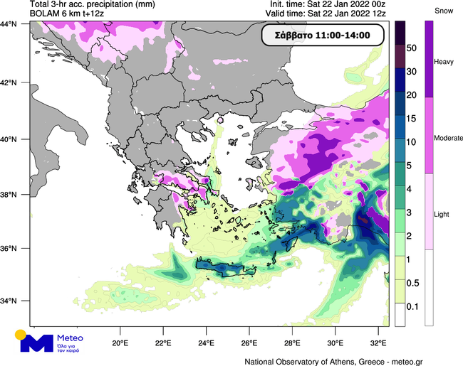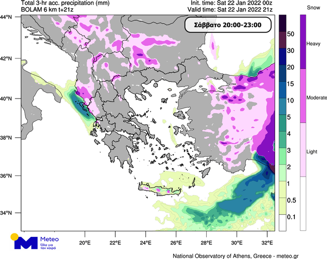 Τις πρώτες νυχτερινές ώρες είναι πιθανό να εκδηλωθούν τοπικές βροχές ή χιονόνερο και ενδεχομένως καταιγίδες στα πεδινά και παραθαλάσσια τμήματα του Ιονίου, τοπικές χιονοπτώσεις στα ορεινά και ημιορεινά πάνω απο τα ~300-400 μέτρα, ενώ τοπικές χιονοπτώσεις είναι πιθανό να εκδηλωθούν ακόμα και σε παραθαλάσσια τμήματα της Ηπείρου και της Δυτικής Στερεάς. Μέσα στη νύχτα προς το ξημέρωμα της Κυριακής 23/01 είναι πιθανό να σημειωθούν τοπικές βροχές ή χιονόνερο στα πεδινά και παραθαλάσσια και τοπικές χιονοπτώσεις πάνω απο τα ~300-400 μέτρα στα δυτικότερα τμήματα της Πελοποννήσου, ενώ οι χιονοπτώσεις στην Εύβοια και το Βόρειο Αιγαίο αναμένονται να ενταθούν εκ νέου. Στους παρακάτω χάρτες παρουσιάζεται ενδεικτικά ο αθροιστικός υετός 3ώρου σε μορφή βροχής με πράσινες και μπλε αποχρώσεις και σε μορφή χιονιού με μωβ αποχρώσεις μεταξύ 11:00 και 14:00 (Γράφημα 1) και μεταξύ 20:00 και 23:00 του Σαββάτου 22/01 (Γράφημα 2).