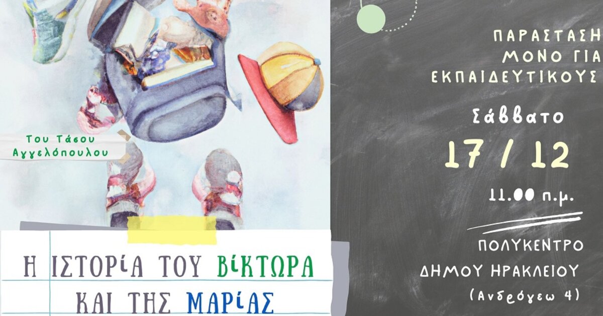 Το Σάββατο 17 Δεκεμβρίου στις 11.00 π.μ, η παράσταση θα παρουσιαστεί στο Πολύκεντρο του Δήμου Ηρακλείου (Ανδρόγεω 4) αποκλειστικά για την εκπαιδευτική κοινότητα και εκπροσώπους Συλλόγων Γονέων και Κηδεμόνων.