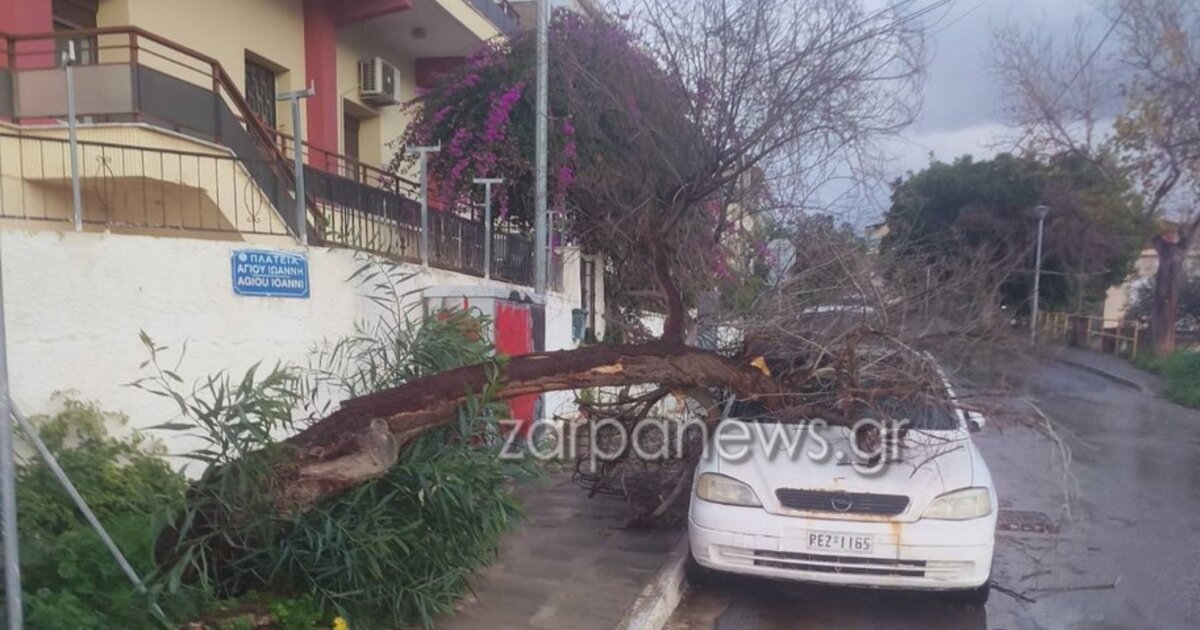 Την ίσια ώρα, στην περιοχή του Αγίου Ιωάννη, ένα δέντρο έπεσε πάνω σε όχημα που βρισκόταν σταθμευμένο από κάτω.