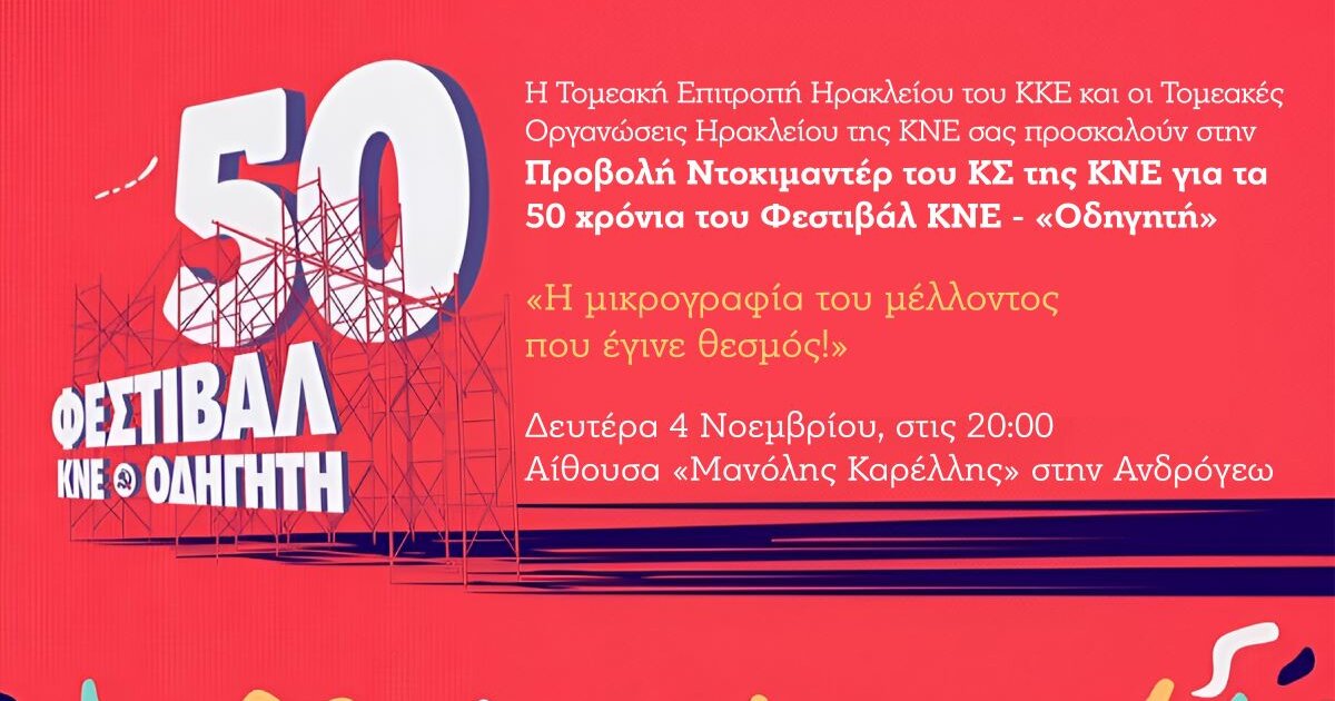 Η Τομεακή Επιτροπή Ηρακλείου του ΚΚΕ και οι Τομεακές Οργανώσεις Ηρακλείου της ΚΝΕ θα πραγματοποιήσουν, τη Δευτέρα 4 Νοεμβρίου στις 20:00 στην Αίθουσα «Μανόλης Καρέλλης» στην Ανδρόγεω, προβολή του ντοκιμαντέρ του ΚΣ της ΚΝΕ αφιερωμένο στα 50 χρόνια του Φεστιβάλ ΚΝΕ - «Οδηγητή», με τίτλο: «Η μικρογραφία του μέλλοντος που έγινε θεσμός».