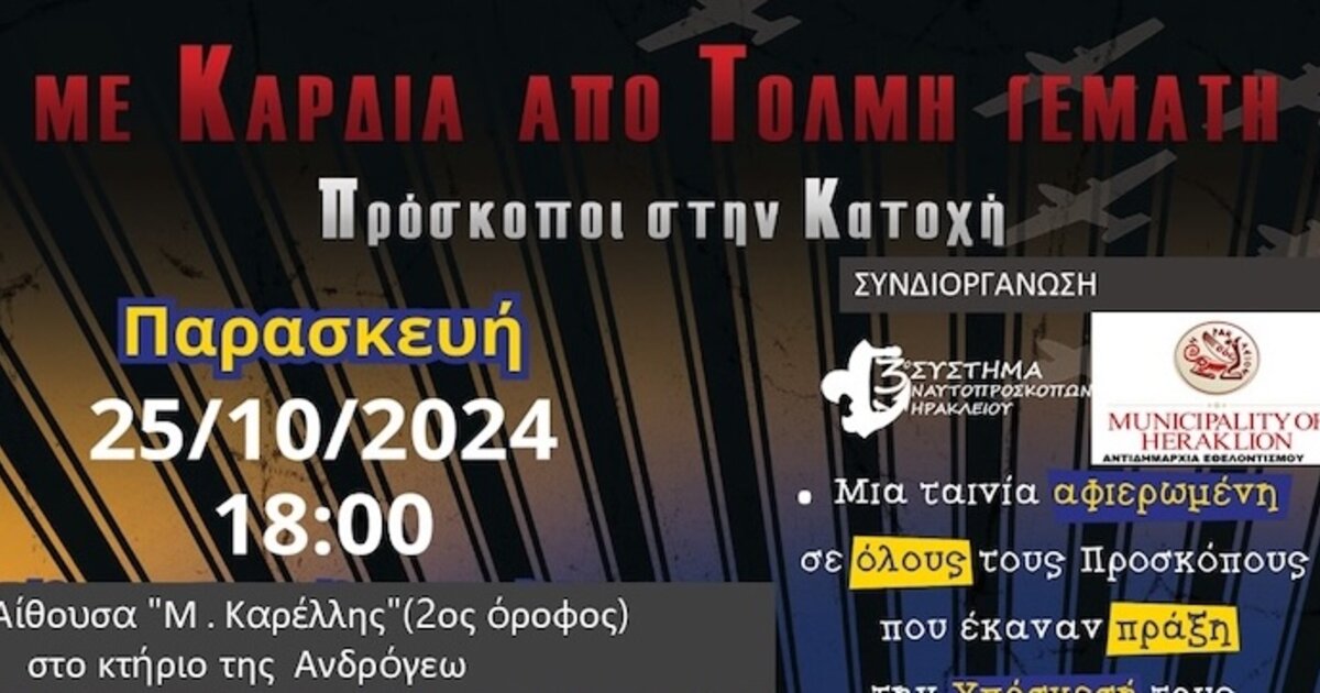 O Δήμος Ηρακλείου – Αντιδημαρχία Εθελοντισμού σε συνεργασία με το 3ο Σύστημα Ναυτοπροσκόπων Ηρακλείου διοργανώνουν εκδήλωση στο πλαίσιο του εορτασμού για τα 110 χρόνια ζωής και προσφοράς του κατά τη διάρκεια της οποίας θα φιλοξενήσει το ντοκιμαντέρ "Με Καρδία από Τόλμη Γεμάτη, Πρόσκοποι στην Κατοχή" του Ιστορικού Αρχείου του Σώματος Ελλήνων Προσκόπων.