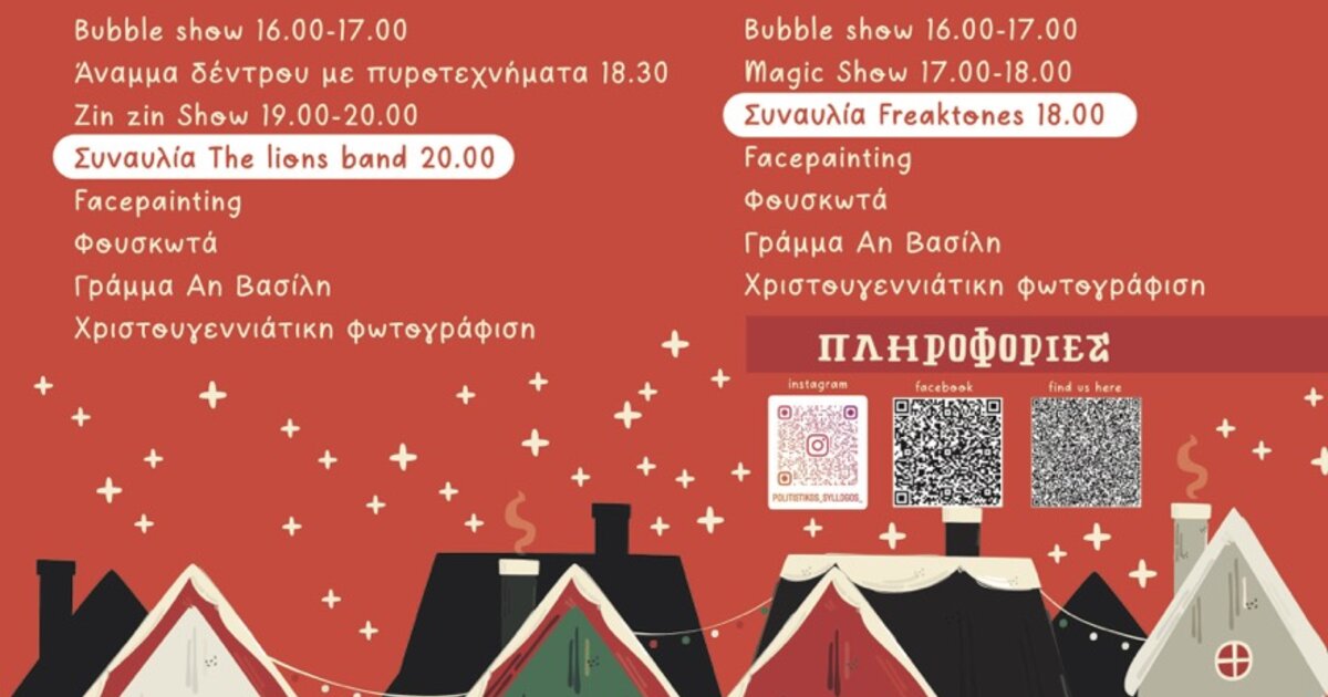 Στις 19:00 το κοινό θα απολαύσει το «Zin Zin Show», ενώ η ημέρα κορυφώνεται με τη συναυλία The Lions Band στις 20:00. Παράλληλες δράσεις όπως facepainting, φυσούκτω, γράμμα στον Άη Βασίλη και χριστουγεννιάτικη φωτογράφιση θα λειτουργούν καθ’ όλη τη διάρκεια του προγράμματος.