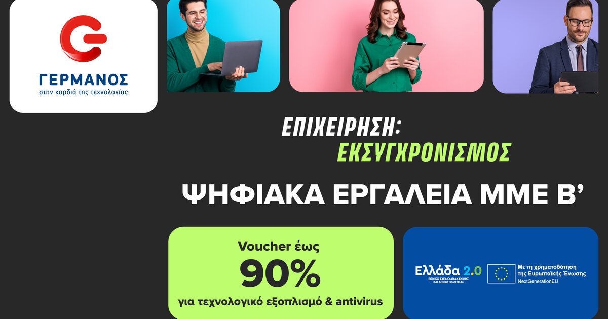 Την επιδότηση voucher έως 90% για αγορά νέου τεχνολογικού εξοπλισμού σε συνδυασμό με software μπορούν να εξαργυρώσουν στην COSMOTE και τον ΓΕΡΜΑΝΟ οι μικρομεσαίες επιχειρήσεις (ΜΜΕ) που συμμετέχουν στο πρόγραμμα «Ψηφιακά Εργαλεία ΜMΕ Β’», της Δράσης «Ψηφιακός Μετασχηματισμός Μικρομεσαίων Επιχειρήσεων».