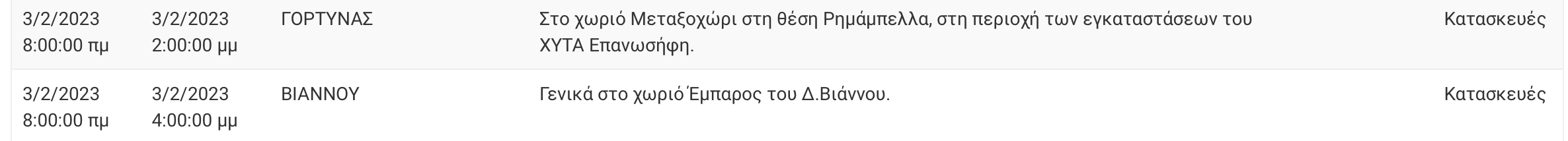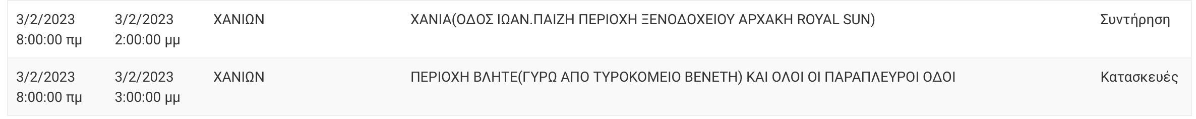 ΚΡΗΤΗΠρογραμματισμένες διακοπές ρεύματος την ΠαρασκευήΤο πρόγραμμα και οι περιοχές02.02.2023NewsroomSHARE: Facebook Twitter Messenger Whatsapp Viber SHARE Facebook Twitter Messenger Whatsapp Viber FacebookTwitterMessengerWhatsappViber Ανακοινώνονται καθημερινά οι προγραμματισμένες διακοπές ρεύματος ανά δήμο της Κρήτης αλλά και τις ώρες που είναι πιθανότερο να διαρκέσουν.Νομός Ηρακλείου Νομός Χανίων Διαβάστε περισσότερες ειδήσεις από την Κρήτη Ακολουθήστε το Cretalive στο Google News και στο FacebookΚάντε εγγραφή στο κανάλι μας στο YouTube Σχετικά Tags Διακοπή Ρεύματος Κρήτη