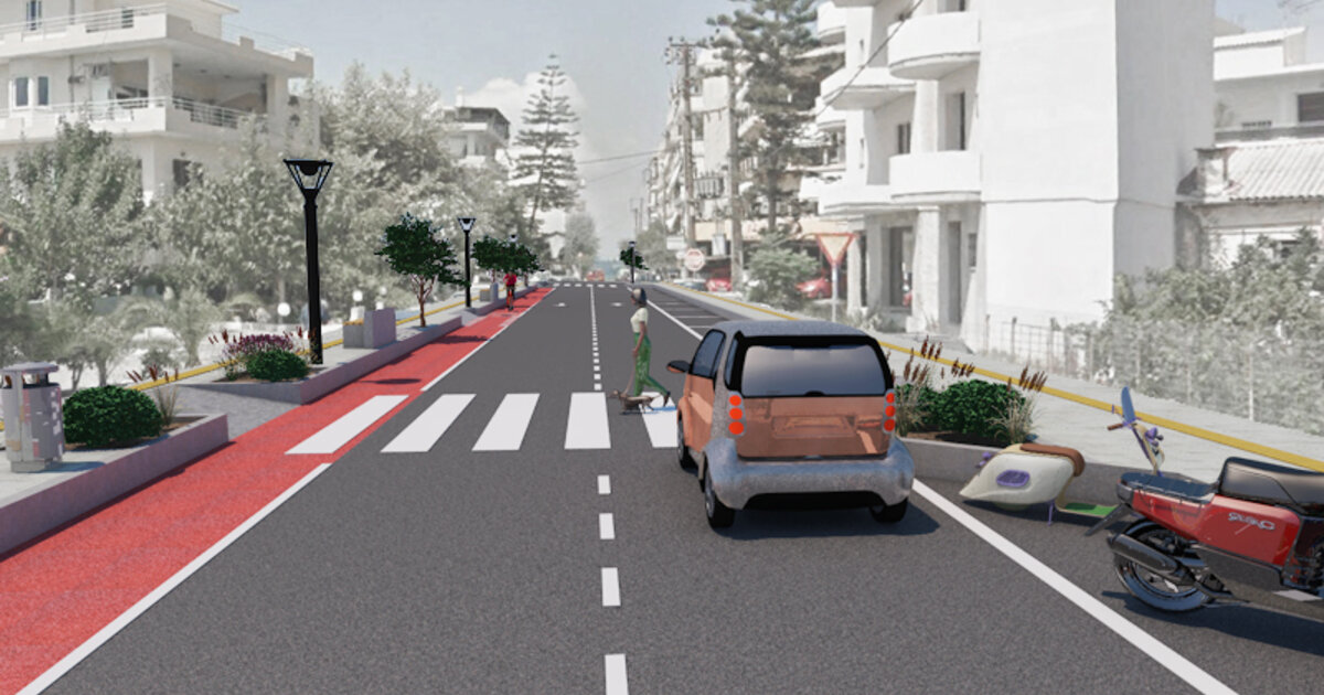 - Η διαπλάτυνση πεζοδρομίων και η διαμόρφωση ποδηλατόδρομου, στη νοτιοδυτική πλευρά του δρόμου.