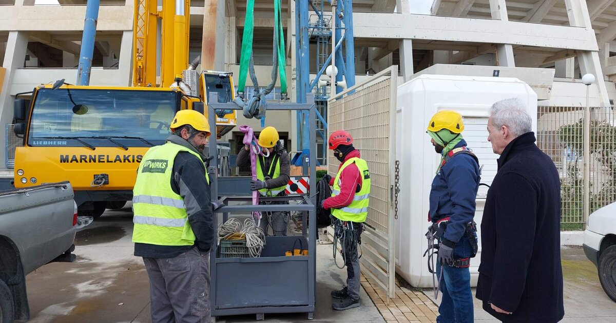 Στο Παγκρήτιο βρέθηκε ξανά το πρωί του Σαββάτου, ο Δήμαρχος Ηρακλείου, Αλέξης Καλοκαιρινός για να δει από κοντά την πρόοδο των εργασιών που εκτελούνται στο στέγαστρο του Παγκρήτιου Σταδίου, μέρος του οποίου αποκολλήθηκε λόγω των ισχυρών ανέμων, προ ημερών.
