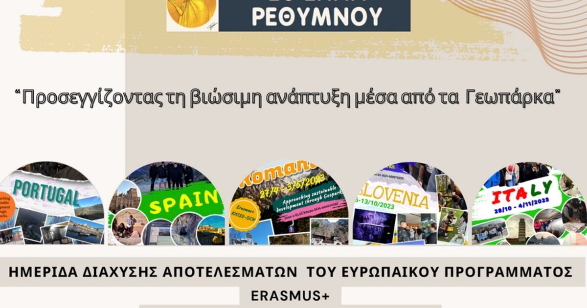 Ημερίδα Διάχυσης Αποτελεσμάτων του Ευρωπαϊκού Προγράμματος Erasmus+ με τίτλο “Προσεγγίζοντας τη βιώσιμη ανάπτυξη μέσα από τα Γεωπάρκα”, πραγματοποιεί το 2ο ΕΠΑΛ Ρεθύμνου.