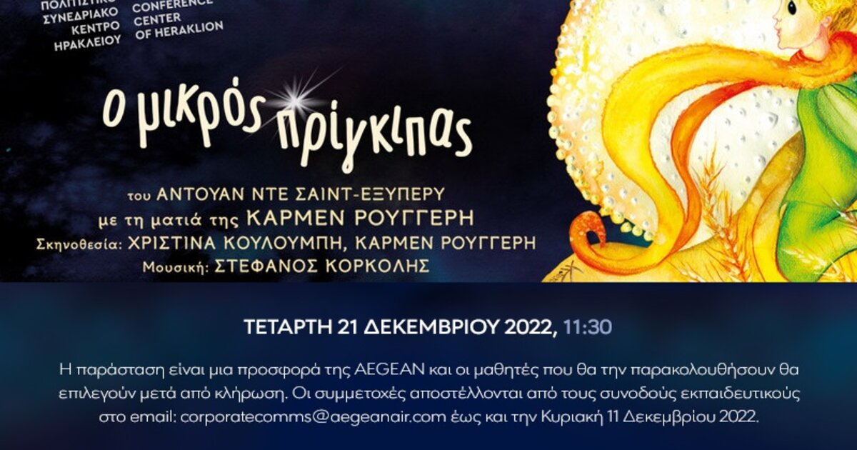 Η AEGEAN στο πλαίσιο των δράσεων εταιρικής κοινωνικής ευθύνης που υλοποιεί με σκοπό να διευκολύνει την πρόσβαση των παιδιών στον πολιτισμό και σε εμπειρίες που τους γεννούν ερεθίσματα, συνεργάζεται με το Πολιτιστικό Συνεδριακό Κέντρο Ηρακλείου (ΠΣΚΗ) και προφέρει τη δυνατότητα σε μαθητές Δημοτικού από όλα τα σχολεία της Κρήτης να παρακολουθήσουν δωρεάν την παιδική παράσταση «Ο Μικρός Πρίγκιπας» που ανεβαίνει στο ΠΣΚ Ηρακλείου σε συνεργασία με την παιδική σκηνή «Κάρμεν Ρουγγέρη».