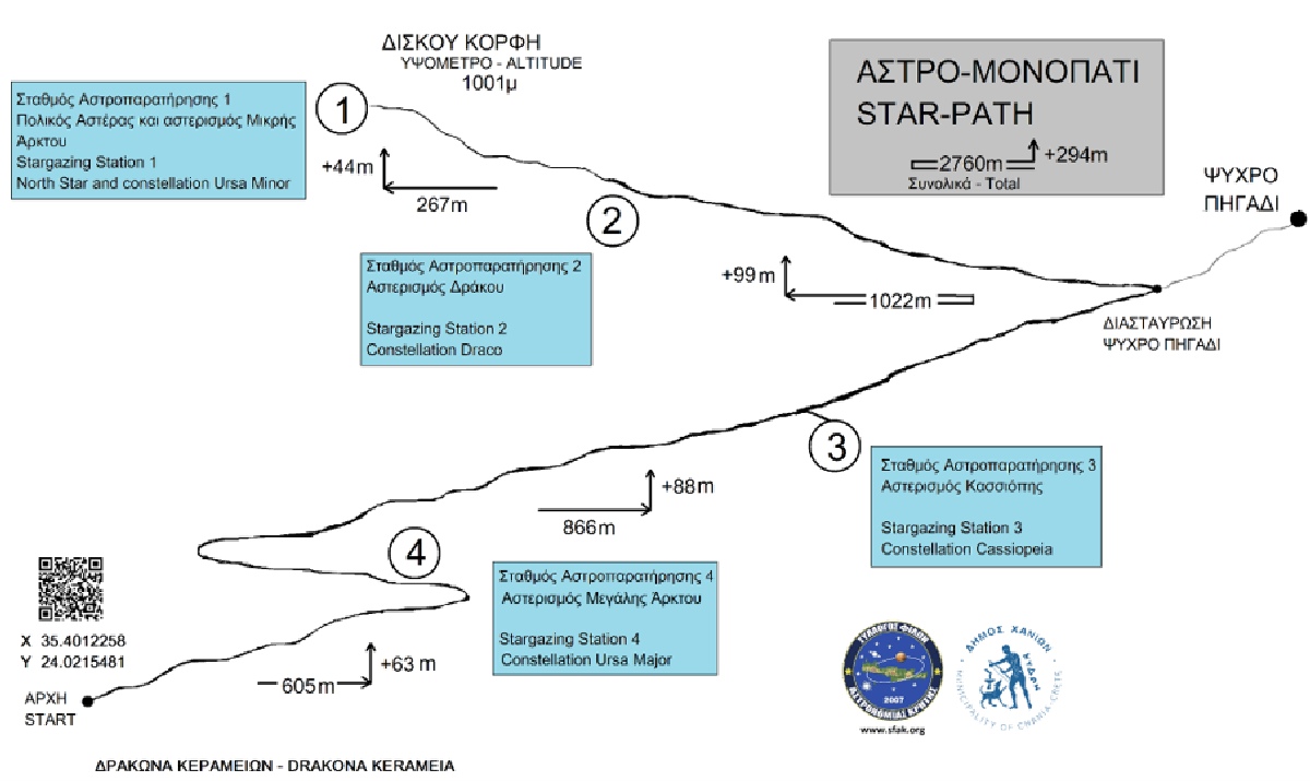 Με δύο σημεία εισόδου, τη Δρακώνα και το Ψυχρό Πηγάδι Κεραμειών, η διαδρομή περιλαμβάνει τέσσερα σημεία - στάσεις αστροπαρατήρησης, αστροχάρτες και πληροφορίες στα ελληνικά και τα αγγλικά, για να γίνεται πιο εύκολος ο εντοπισμός των μεγάλων αστερισμών, όπως αυτών της Μικρής και της Μεγάλης Άρκτου, της Κασσιόπης και του Δράκοντος.