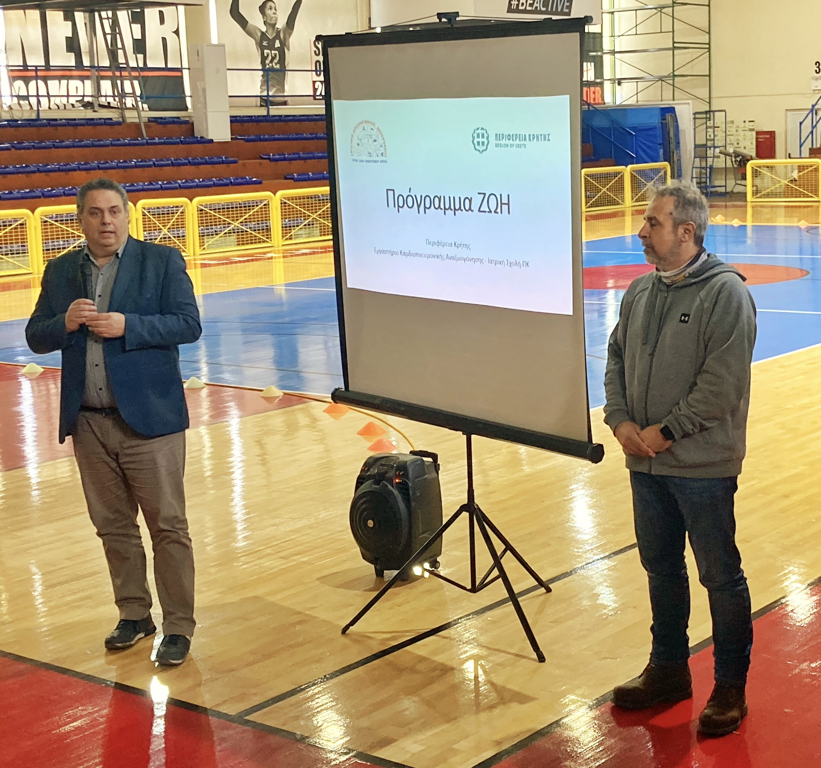 Το πρωτοποριακό πρόγραμμα «ΖΩΗ» της Περιφέρειας Κρήτης, παρουσιάστηκε σε επιμορφωτικό σεμινάριο που διοργάνωσε, σήμερα στο κλειστό γυμναστήριο Λίντο, το γραφείο φυσικής αγωγής της πρωτοβάθμιας εκπαίδευσης Ηρακλείου. Η παρουσίαση έγινε από τον Αναπληρωτή Περιφερειάρχη Γιώργο Πιτσούλη και από εκπαιδεύτριες του Εργαστηρίου Καρδιοπνευμονικής Αναζωογόνησης της Ιατρικής Σχολής του Πανεπιστημίου Κρήτης, Αναστασία Σπαρτινού και Δαριβιανάκη Παναγιώτα.