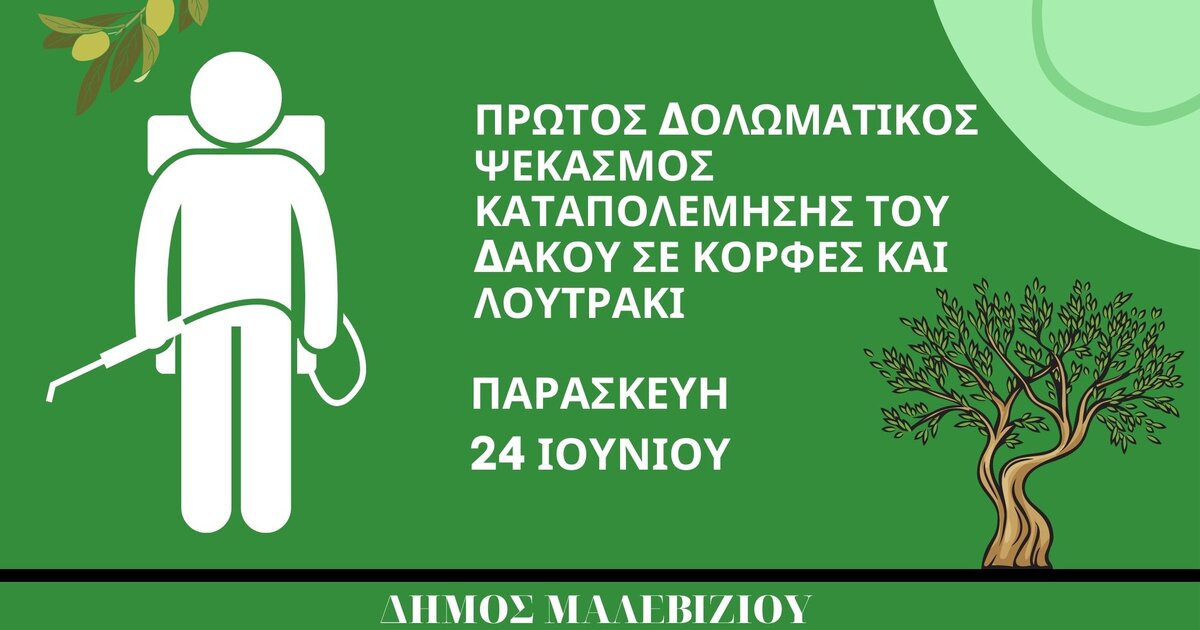 Παρακαλούνται όσοι ελαιοπαραγωγοί έχουν περιφραγμένα ελαιόφυτα να μεριμνήσουν ώστε ο εργολάβος ψεκασμού να έχει πρόσβαση στα δένδρα τους για να μπορεί να τα ψεκάσει και οι βιοκαλλιεργητές να σημαδέψουν τα ελαιόφυτά τους για να αποφευχθεί ανεπιθύμητος ψεκασμός.