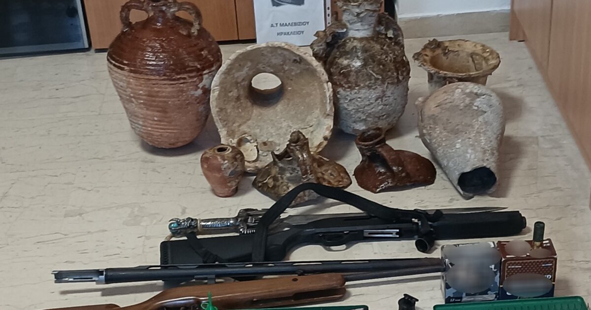 Επιπλέον, πρωινές ώρες, σήμερα (30.07.2024) πραγματοποιήθηκε συντονισμένη αστυνομική επιχείρηση που συμπεριελάμβανε έρευνες σε οικίες του ανωτέρω ημεδαπού και δύο ακόμη, ημεδαπών ατόμων σε περιοχές του Δήμου Ηρακλείου και του Δήμου Μαλεβιζίου. Οι ανωτέρω δύο (2) ημεδαποί συνελήφθησαν για τα κατά περίπτωση για τις κατά περίπτωση παραβάσεις Νομοθεσίας περί όπλων και Νομοθεσίας περί προστασίας αρχαιοτήτων και εν γένει πολιτιστικής κληρονομιάς.