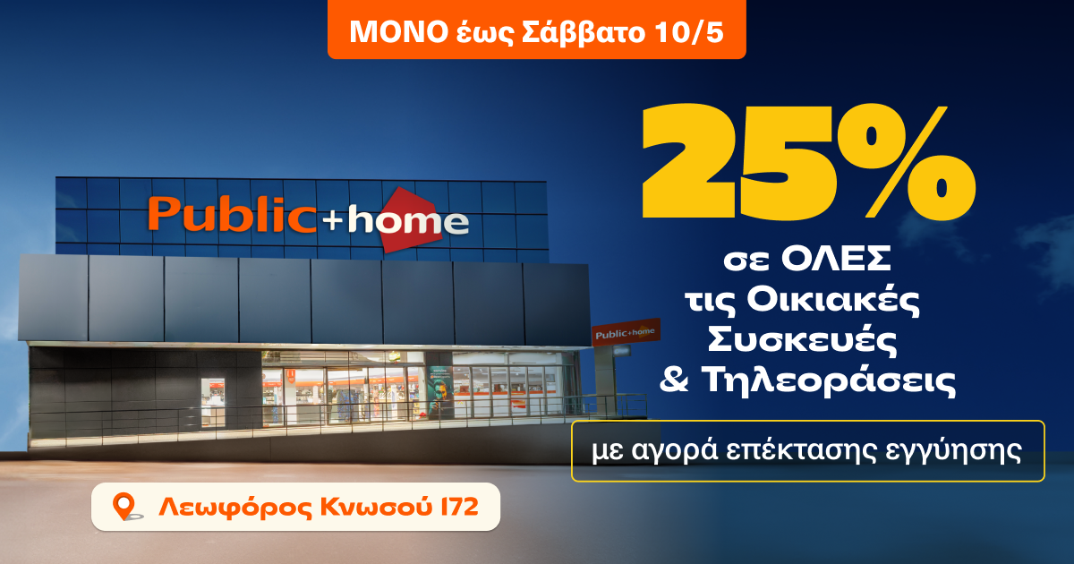 Από τις 5 έως και τις 10 Μαΐου, το μεγάλο “Public + home” Ηρακλείου προσφέρει στους επισκέπτες άμεσο όφελος -25%* σε ΟΛΕΣ τις μεγάλες και μικρές οικιακές συσκευές καθώς και στις τηλεοράσεις, με την αγορά επέκτασης εγγύησης “Safety Net”.