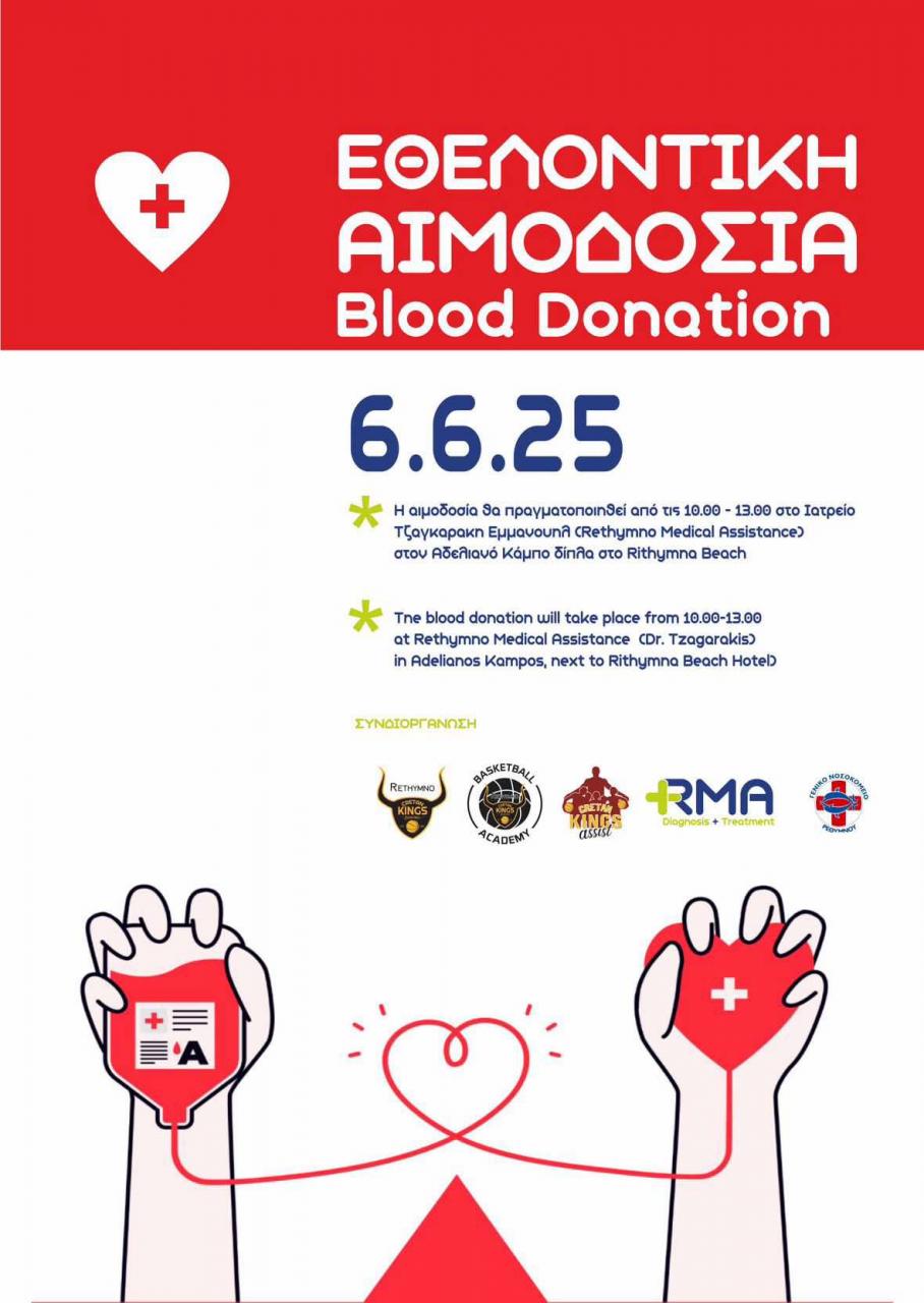 Εθελοντική αιμοδοσία διοργανώνει το Ρέθυμνο Cretan Kings την Παρασκευή 6 Ιουνίου, στο πλαίσιο του Κοινωνικού προγράμματος, Cretan Kings Assist και σε συνεργασία με τα ιατρεία Rethymno Medical Assistance και το Γενικό Νοσοκομείο Ρέθυμνου.