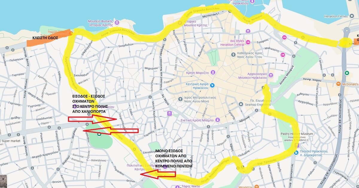 • Η κάθοδος της Λεωφόρου Δημοκρατίας προς το κέντρο Ηρακλείου θα είναι ανοικτή, με κατεύθυνση προς Καπετανάκειο – Ανθεμίου – Αρχιμήδους – Τίτου Γεωργιάδη – Λ. Ικάρου.