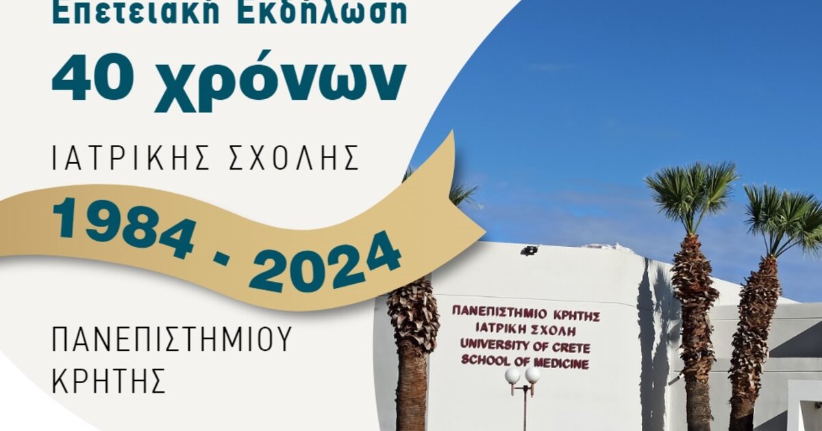 Η Ιατρική Σχολή του Πανεπιστημίου Κρήτης πραγματοποιεί την κεντρική εκδήλωση για τον εορτασμό των 40 χρόνων λειτουργίας της, την Τετάρτη 18 Δεκεμβρίου 2024, 18.30 έως 22.00, στην αίθουσα «Καστελλάκη» του Επιμελητήριου Ηρακλείου.