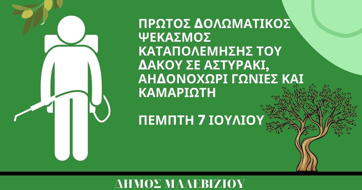 Παρακαλούνται όσοι ελαιοπαραγωγοί έχουν περιφραγμένα ελαιόφυτα να μεριμνήσουν ώστε ο εργολάβος ψεκασμού να έχει πρόσβαση στα δένδρα τους για να μπορεί να τα ψεκάσει και οι βιοκαλλιεργητές να σημαδέψουν τα ελαιόφυτά τους για να αποφευχθεί ανεπιθύμητος ψεκασμός.