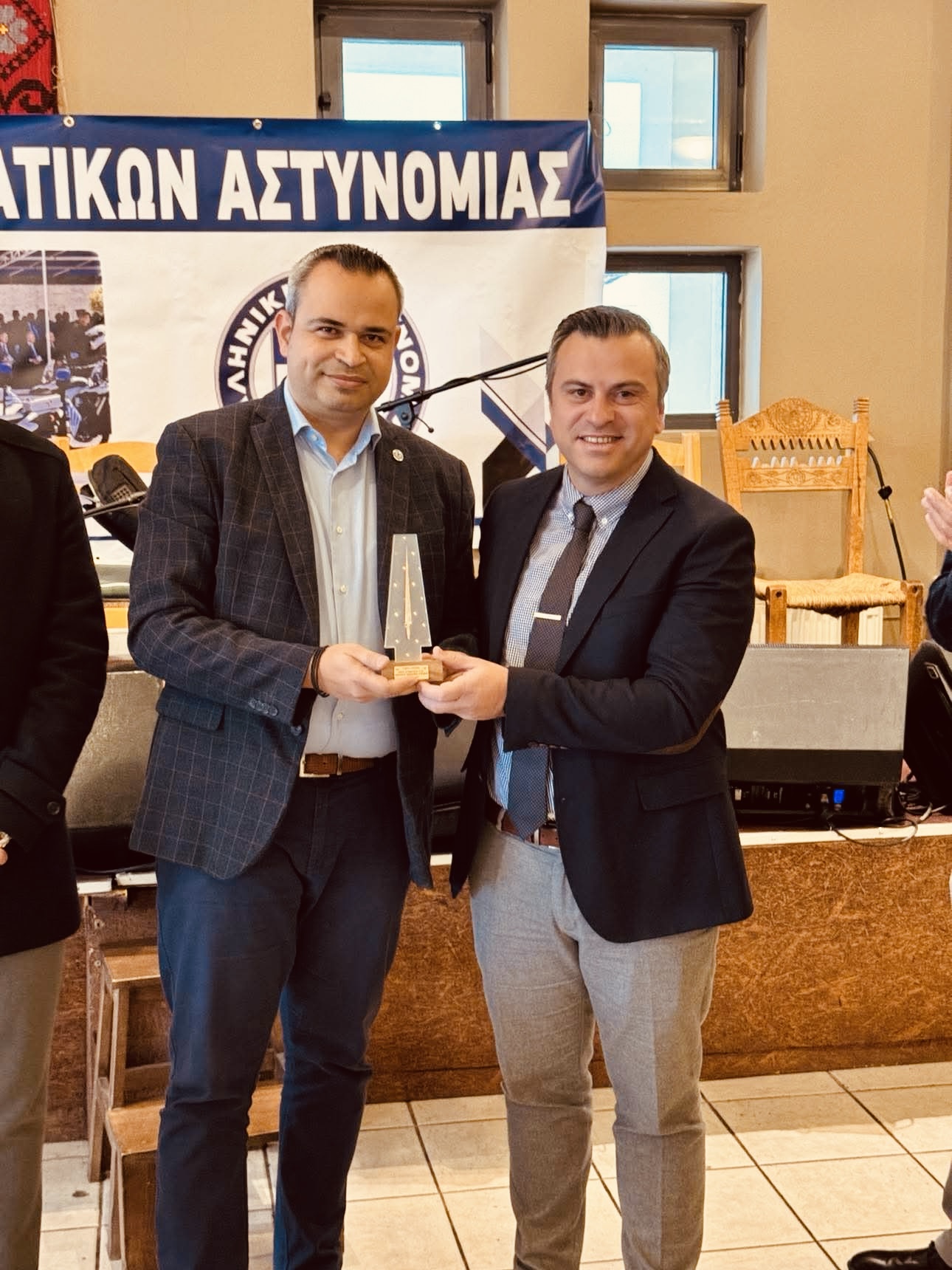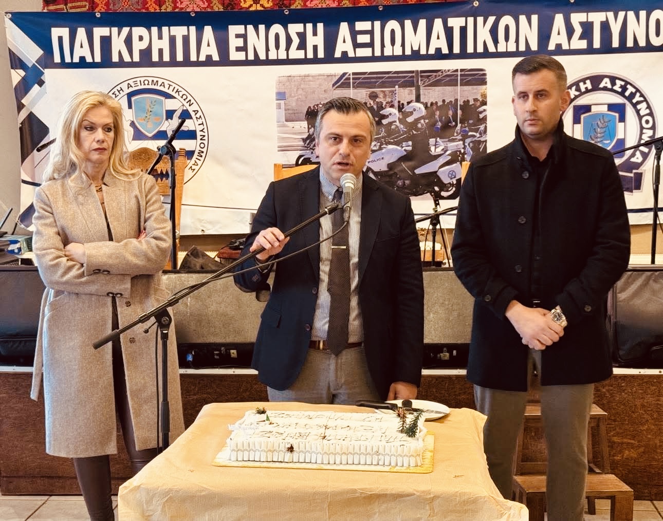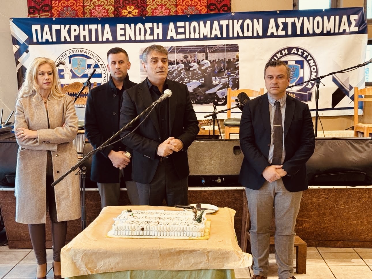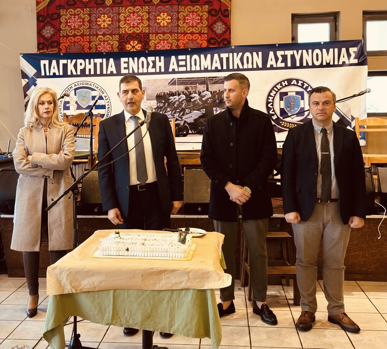 Κατά τον χαιρετισμό του ο Πρόεδρος της Ένωσης Αξιωματικών ΕΛ.ΑΣ. Περιφέρειας Κρήτης Καρακούδης Στυλιανός, αναφέρθηκε αρχικά στην επιλογή από το Διοικητικό Συμβούλιο του ιστορικού τόπου των Ανωγείων για την κοπή της πρωτοχρονιάτικης πίτας της Ένωσης και μάλιστα τη συμβολική αυτή ημέρα της 8η Φεβρουαρίου 2025, ακριβώς 45 χρόνια μετά το θάνατο του Αρχάγγελου της Κρήτης Νίκου Ξυλούρη. Επίσης μνημόνευσε τη στάση του άλλου μεγάλου κρητικού καλλιτέχνη των Ανωγείων Βασίλη Σκουλά και ιδιοκτήτη του κέντρου Ντελίνα που πραγματοποιήθηκε η εκδήλωση, που χρόνια πρεσβεύει, κατά των άσκοπων πυροβολισμών και κατά της αλόγιστης κατανάλωσης του αλκοόλ στα γλέντια σε συνδυασμό με την οδήγηση υπό την επίδραση οινοπνεύματος. Για τα θέματα που αφορούν τον κλάδο, ο Πρόεδρος επισήμανε τη μεγάλη πρόσφατη επιτυχία της αναγνώρισης του επαγγέλματος του αστυνομικού ως επικίνδυνο, ένα αίτημα που η ομοσπονδία και τα πρωτοβάθμια σωματεία διεκδικούσαν τα 30 τελευταία χρόνια και που επιτέλους έγινε πραγματικότητα, αναφέρθηκε στο εσχάτως ανακύψαν ζήτημα της κατάργησης του αμετάθετου των Αστυνομικών Υποδιευθυντών το οποίο ευτυχώς επιλύθηκε κατόπιν άμεσης παρέμβασης της Ομοσπονδίας, για την ομόφωνη απόφαση του Δ.Σ. της Πανελλήνιας Ομοσπονδίας Αξιωματικών Αστυνομίας να προσφύγουν και τα 19 μέλη του Δ.Σ. ενώπιον του Διοικητικού Πρωτοδικείου για την διεκδίκηση και την παράλειψη της επαναφοράς του 13ου και 14ου μισθού, προκειμένου να επιλυθεί οριζόντια το ζήτημα, προς αποφυγή οικονομικής επιβάρυνσης των συναδέλφων. Τόνισε την προσπάθεια που καταβάλλεται προκειμένου να επεκταθεί η μάχιμη πενταετία σε επταετία με την καταβολή του ίδιου ποσού εισφοράς, καθώς και για την αναπροσαρμογή του επιδόματος ευθύνης και τον καθορισμό του επιδόματος θέσης για τους διοικητές των υπηρεσιών αντίστοιχα όπως συμβαίνει και στον υπόλοιπο δημόσιο τομέα.