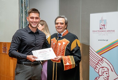 - Απονομή Επαίνων Αριστούχων Φοιτητών Πολυτεχνείου Κρήτης από τον Αντιπρύτανη Διοικητικών, Τεχνικών Υποθέσεων και Φοιτητικής Μέριμνας, Καθ. Αριστομένη Αντωνιάδη και την Αντιπρύτανη Οικονομικών και Ανάπτυξης Καθ. Δανάη Βενιέρη, σε αποφοίτους, οι οποίοι πληρούν τα κριτήρια αριστείας που θέσπισε η Σύγκλητος του Πολυτεχνείου Κρήτης στην 607η/03.11.2022 συνεδρίασή της και τα οποία συνυπολογίζουν τόσο την κανονική πρόοδο στο πρόγραμμα σπουδών, όσο και τον υψηλό μέσο όρο βαθμολογίας από τα ολοκληρωμένα μαθήματα. Βραβεύθηκαν οι:
