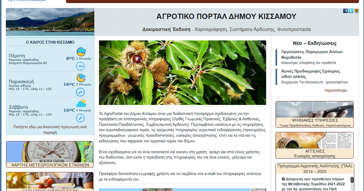 Το αγροτικό portal agro.kissamos.gr, έθεσε σε λειτουργία ο Δήμος Κισσάμου σε μια προσπάθεια ενίσχυσης της ενημέρωσης των δημοτών της περιοχής που δραστηριοποιούνται στον πρωτογενή τομέα.