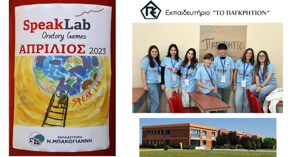 Μια ομάδα μαθητών του Εκπαιδευτηρίου “TO ΠΑΓΚΡΗΤΙΟΝ” ταξίδεψε στη Λάρισα για τον διαγωνισμό «SPEAK LAB ORATORY GAMES» που διοργάνωσαν με μεγάλη επιτυχία τα Εκπαιδευτήρια Μπακογιάννη την Παρασκευή 28/4 και το Σάββατο 29/4. Πρόκειται για αγώνες Έντεχνου Ρητορικού Λόγου στα Αγγλικά με πολλά διαφορετικά αγωνίσματα: Debate (Διττούς Λόγους), Group discussion (Ομαδική συζήτηση), Oral Interpretation of Literature (Εκφραστική ανάγνωση), Monologue (Θεατρικό μονόλογο) και Duet acting (υποκριτική για δυο πρόσωπα).