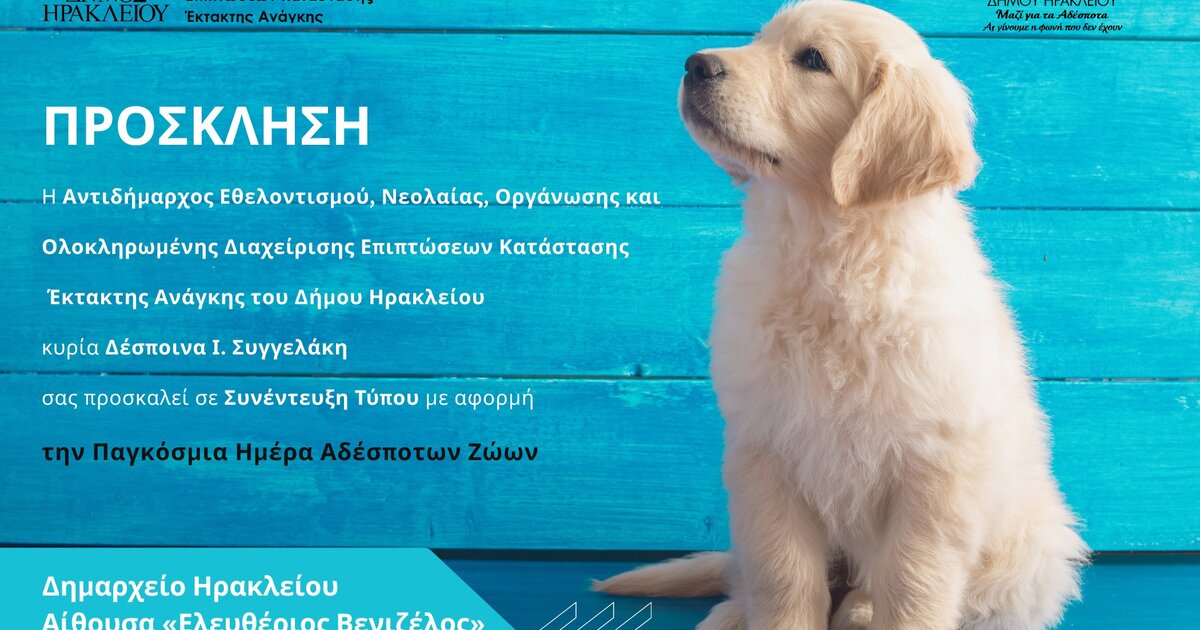 Με αφορμή την Παγκόσμια Ημέρα Αδέσποτων Ζώων ο Δήμος Ηρακλείου/Αντιδημαρχία Εθελοντισμού, Νεολαίας, Οργάνωσης και Ολοκληρωμένης Διαχείρισης Επιπτώσεων Έκτακτης ανάγκης διοργανώνει συνέντευξή τύπου αύριο Τρίτη 4 Απριλίου 2023, στις 12.30 το μεσημέρι στην αίθουσα «Ελευθέριος Βενιζέλος» στη Λότζια, προκειμένου να γίνει ενημέρωση σχετικά με τις ενέργειες του Δήμου Ηρακλείου για το μεγάλο αυτό ζήτημα.
