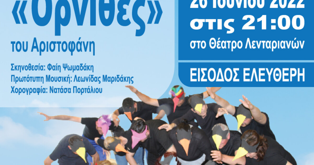 - Την Κυριακή 26/06/2022, η θεατρική ομάδα «ΚΕ-ΘΕΑΣΙΣ» του Πολυδύναμου Κέντρου Χανίων του ΚΕΘΕΑ ΑΡΙΑΔΝΗ σε συνδιοργάνωση με τον Δήμο Χανίων, παρουσιάζουν τη θεατρική παράσταση «Όρνιθες» του Αριστοφάνη, στο Θέατρο Λενταριανών, στις 21:00.