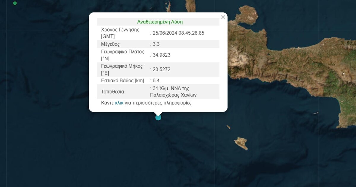 Σεισμική δόνηση 3,3 βαθμών της κλίμακας Ρίχτερ σημειώθηκε λίγο πριν τις 12 το μεσημέρι της Τρίτης 25 Ιουνίου, στα Χανιά