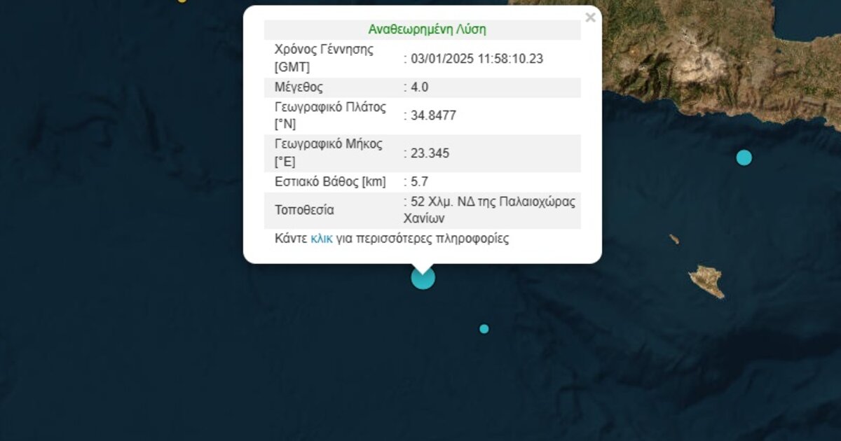 Η δόνηση σημειώθηκε στα 52 χλμ. ΝΔ της Παλαιόχωρας Χανίων και το εστιακό βάθος υπολογίζεται στα 5,7 χιλιόμετρα.
