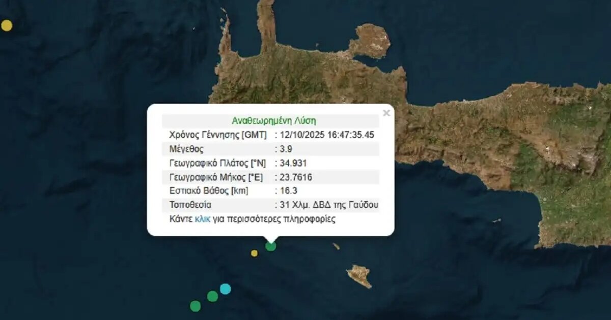Σεισμός 3,9 ρίχτερ σημειώθηκε το απόγευμα της Κυριακής (12/10) νότια της Κρήτης, κοντά στη Γαύδο.