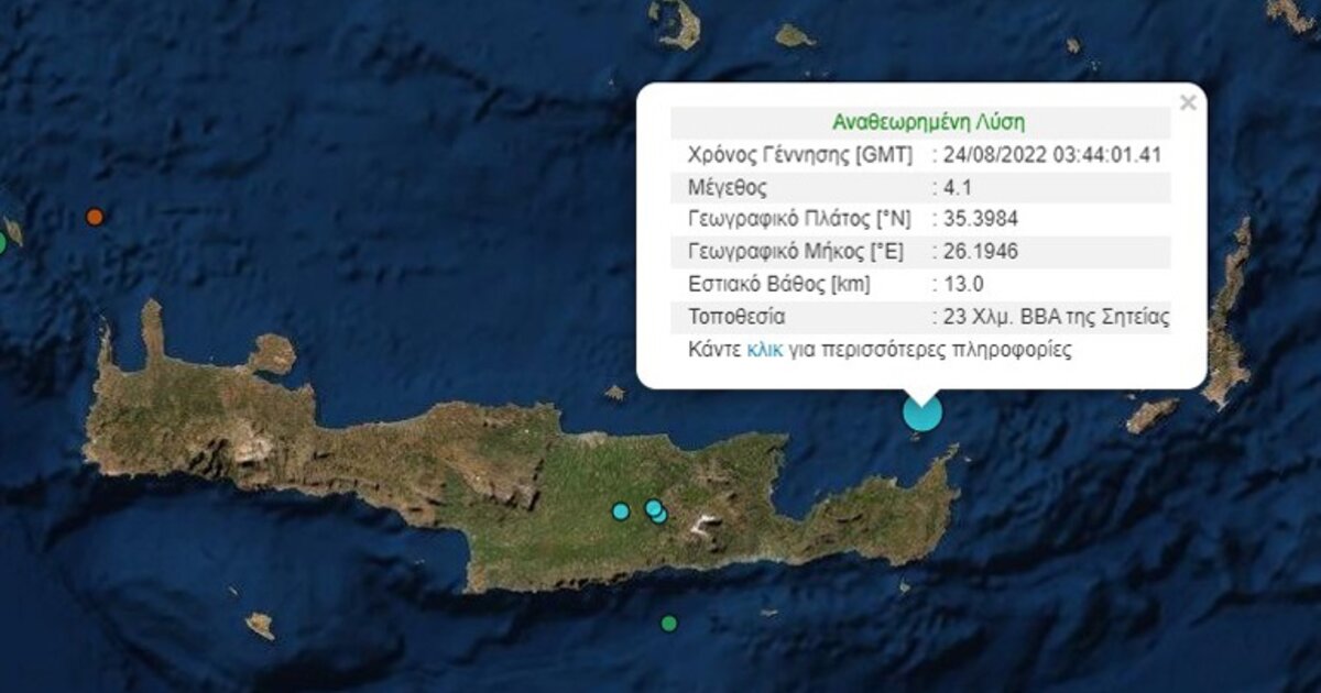 Σεισμική δόνηση μεγέθους 4,1 βαθμών της κλίμακας Ρίχτερ σημειώθηκε στις 6:44 το πρωί της Τετάρτης στην Κρήτη.