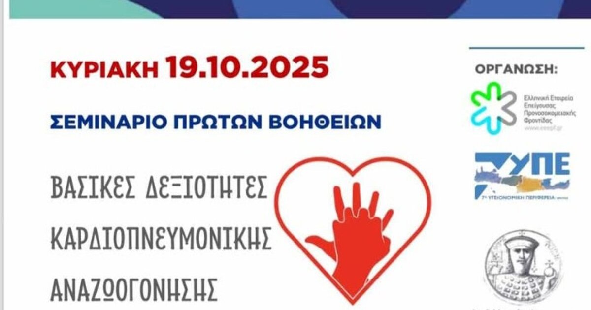 Σεμινάριο πρώτων βοηθειών το οποίο θα επικεντρωθεί στις βασικές δεξιότητες Καρδιοπνευμονικής Αναζωογόνησης (ΚΑΡΠΑ) θα πραγματοποιηθεί την Κυριακή 19 Οκτωβρίου στις 11 το πρωί, στο Πολιτιστικό Πολύκεντρο Ιεράς Μητροπόλεως Αρκαλοχωρίου, Καστελλίου και Βιάννου στο Αρκαλοχώρι Ηρακλείου.