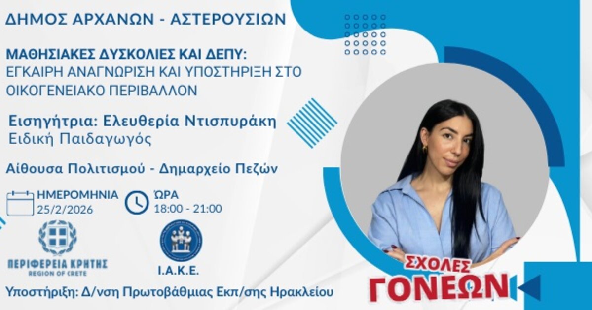 Συνεχίζονται οι Σχολές Γονέων από την Περιφέρεια Κρήτης και το ΙΑΚΕ στον Δήμο Αρχανών - Αστερουσίων με θέμα «Μαθησιακές δυσκολίες και ΔΕΠΥ: Έγκαιρη αναγνώριση και υποστήριξη στο οικογενειακό περιβάλλον»