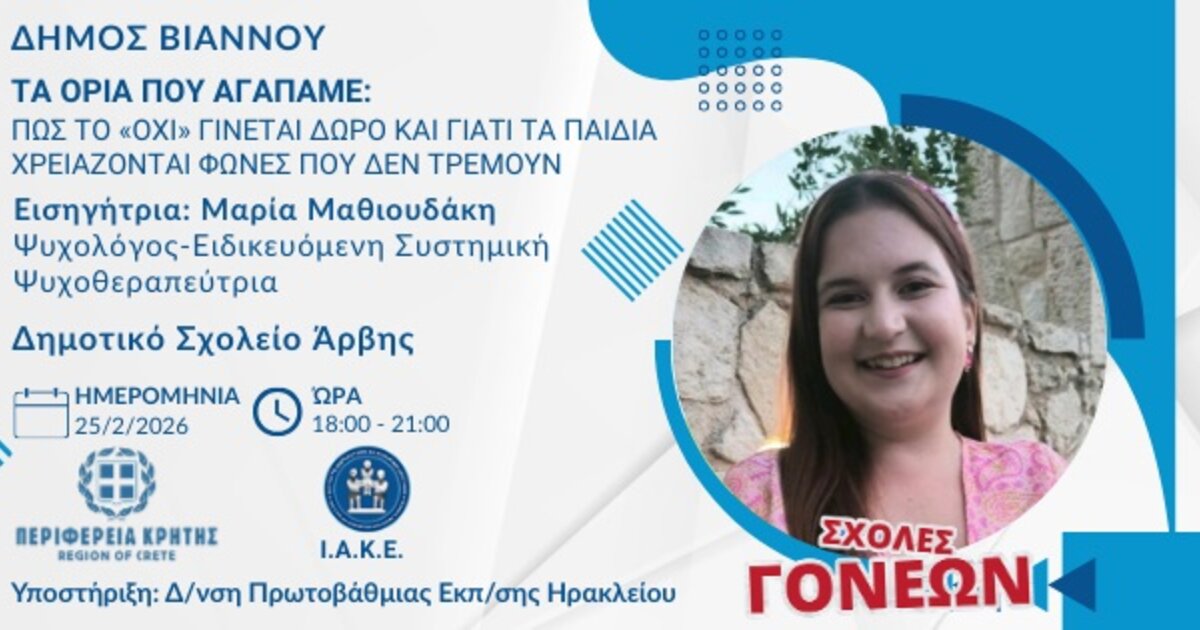 Η Περιφέρεια Κρήτης, το Ινστιτούτο Ανθρωπιστικών και Κοινωνικών Επιστημών (ΙΑΚΕ) σε συνεργασία με τον Δήμο Βιάννου, πραγματοποιούν συνάντηση στο πλαίσιο του 2ου κύκλου της Σχολής Γονέων, την Τετάρτη 25 Φεβρουαρίου 2026 και ώρα 18:00 - 21:00 στο Δημοτικό Σχολείο Άρβης.