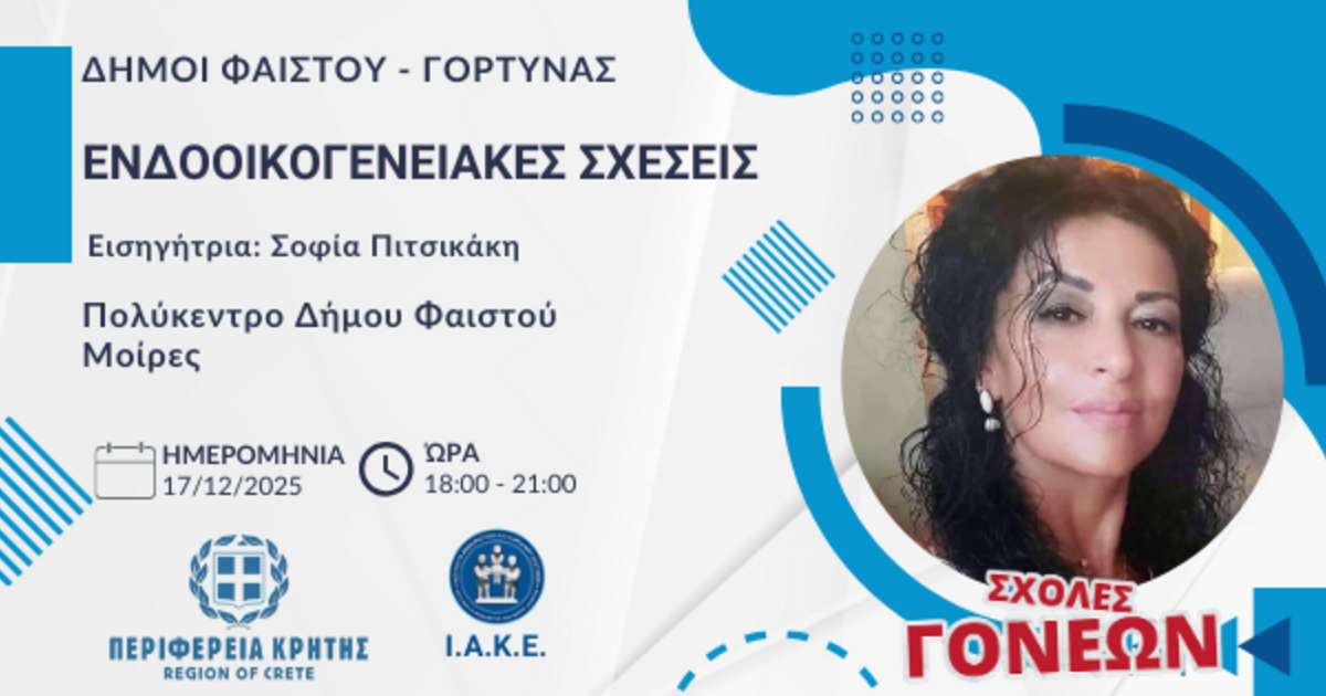 Ο Δήμος Φαιστού, σε συνεργασία με την Περιφέρεια Κρήτης και το Ινστιτούτο Ανθρωπιστικών και Κοινωνικών Επιστημών (ΙΑΚΕ), ενημερώνει, ότι την Τετάρτη 17 Δεκεμβρίου 2025, από 18:00 έως 21:00, θα πραγματοποιηθεί συνάντηση στο πλαίσιο του 2ου κύκλου της Σχολής Γονέων, στο Πολύκεντρο του Δήμου Φαιστού στις Μοίρες.
