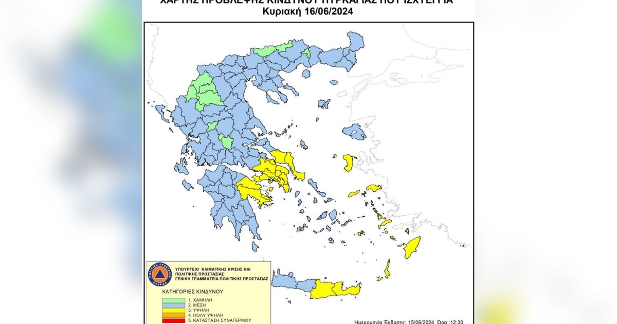 Στην κατηγορία "3", του "κίτρινου" συναγερμού βρίσκεται σήμερα Κυριακή, η ανατολική Κρήτη, ως προς τον κίνδυνο εκδήλωσης πυρκαγιάς.