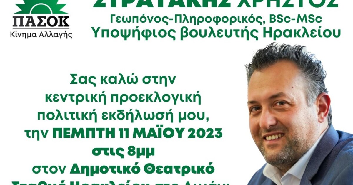 Απόψε στις 8 το βράδυ στον Δημοτικό Θεατρικό Σταθμό Ηρακλείου στο λιμάνι, θα πραγματοποιήσει την κεντρική προεκλογική του ομιλία ο υποψήφιος βουλευτής Ηρακλείου του ΠΑΣΟΚ-Κίνημα Αλλαγής κ.Χρήστος Στρατάκης.