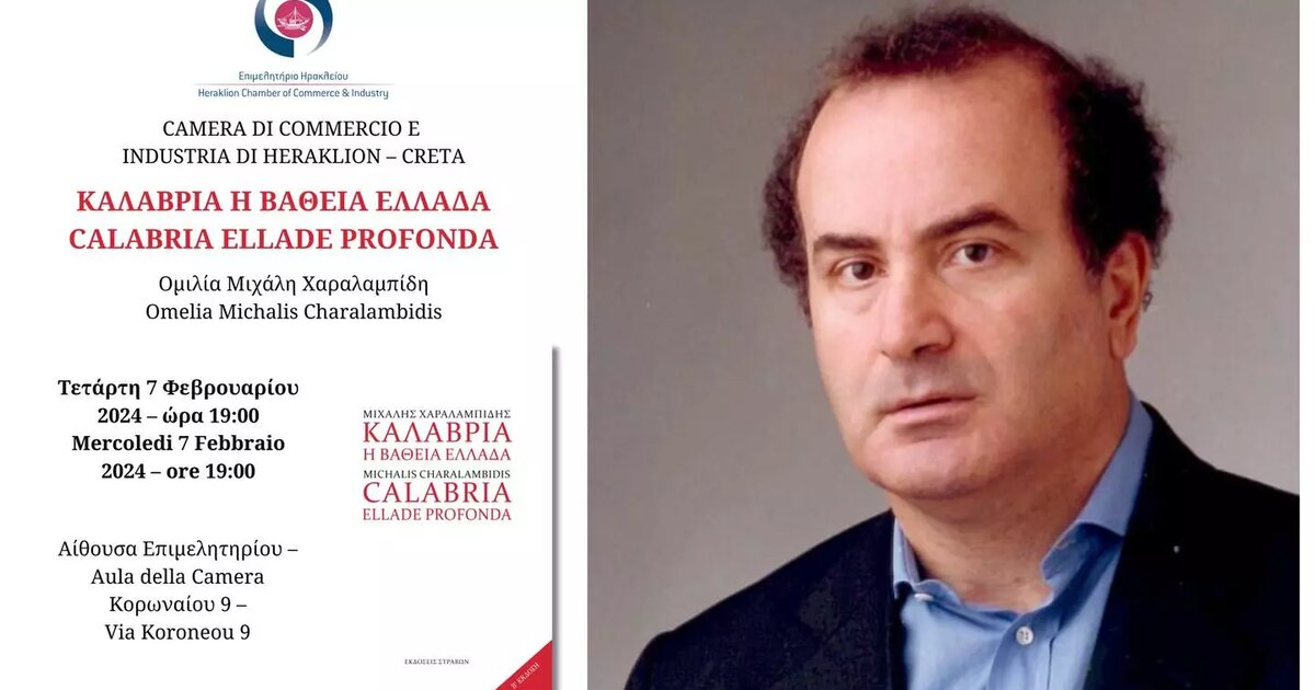 Ομιλία με θέμα «ΚΑΛΑΒΡΙΑ, Η ΒΑΘΕΙΑ ΕΛΛΑΔΑ» του πολιτικού κοινωνιολόγου και συγγραφέα Μιχάλη Χαραλαμπίδη πραγματοποιείται στο Επιμελητήριο Ηρακλείου, σήμερα Τετάρτη 07/02/2024 και ώρα 19:00 μ.μ.